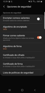 - Dentro de la configuración de la cuenta diríjase a Ajustes Avanzados > Opciones de seguridad, para habilitar las funciones de cifrado y firma.